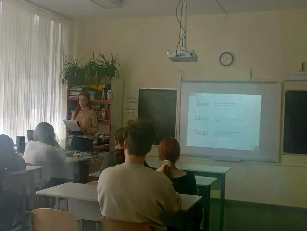 Библиотекарь рассказала о типичных ошибках, которые совершают выпускники при выборе профессии: следование моде, давление родителей или выбор «за компанию». Она подчеркнула, что главное - честно ответить себе на вопросы: «Что мне нравится?», «Что у меня получается?» и «Что востребовано в обществе?». Именно на этих принципах строится формула осознанного выбора: «ХОЧУ–МОГУ–НАДО». На примере одной из учениц специалисты вместе с классом разобрали, как применить эту формулу на практике.