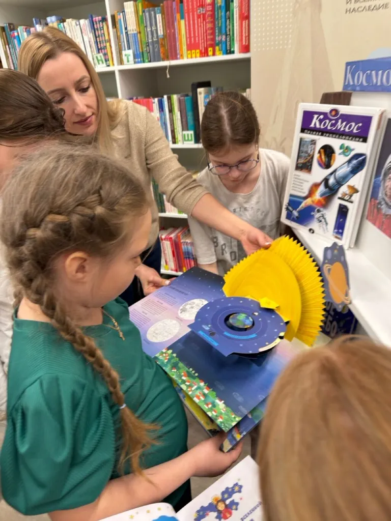 Центральным событием Дня стала выставка-просмотр «Космос в книгах». На ней демонстрировались самые яркие и познавательные издания о космосе из фонда библиотеки. Ребята познакомились с красочными энциклопедиями, рассказывающими о строении Солнечной системы, о далёких звёздах и галактиках, о загадочных чёрных дырах и кометах. Особое внимание привлекли книги о первых космонавтах, об истории освоения космоса и о современных космических исследованиях.