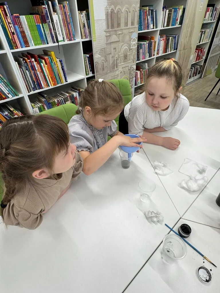 Но самым ярким моментом мероприятия стал практический эксперимент. Библиотекарь предложила ребятам превратиться в настоящих экологов и очистить воду. Перед ними стоял стакан с мутной, грязной водой. Ведущая показала, как из подручных материалов - ваты, марли, активированного угля и песка - можно сделать фильтр. Каждый хотел попробовать сам! И когда грязная вода, пройдя через все слои фильтра, начала капать в чистый стакан прозрачными каплями, в зале раздались радостные возгласы: «Получилось!». Конечно, такая вода ещё не пригодна для питья, но главное - дети увидели: загрязнение можно остановить. И если каждый сделает хотя бы один маленький шаг, наша планета скажет спасибо.